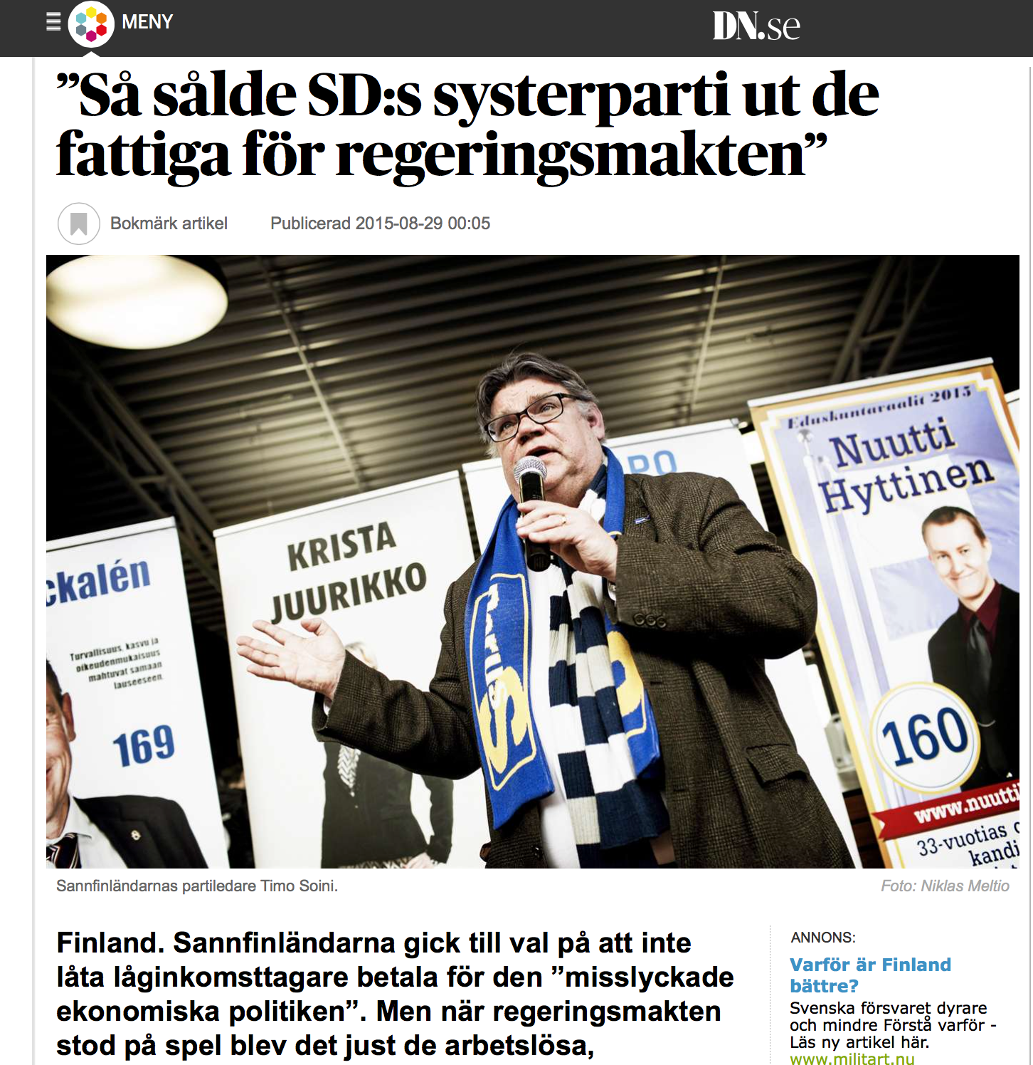 Folkhemsretorik och fördelningspolitik är en tunn fernissa på högerpopulismen. I december 2014 röstade Sverigedemokraterna ner sina egna vallöften om lägre skatt för pensionärer, högre a-kassa och mer pengar till äldreomsorgen när de stödde Alliansens förslag till statsbudget. Det var viktigare att spela politiskt spel, visa sin makt och försöka bli ett borgerligt stödparti än att hålla det man lovat på torgmötena inför valet. I valrörelsen ville partiet ta bort vinstjakten från den svenska skolan, nu vill de rädda riskkapitalets vinster i välfärden ihop med de borgerliga partierna. Mönstret i Finland och Sverige är detsamma. Arbetarrörelsen måste bekämpa SD:s rasism såväl som deras högerpolitik. De är en del av samma strategi.