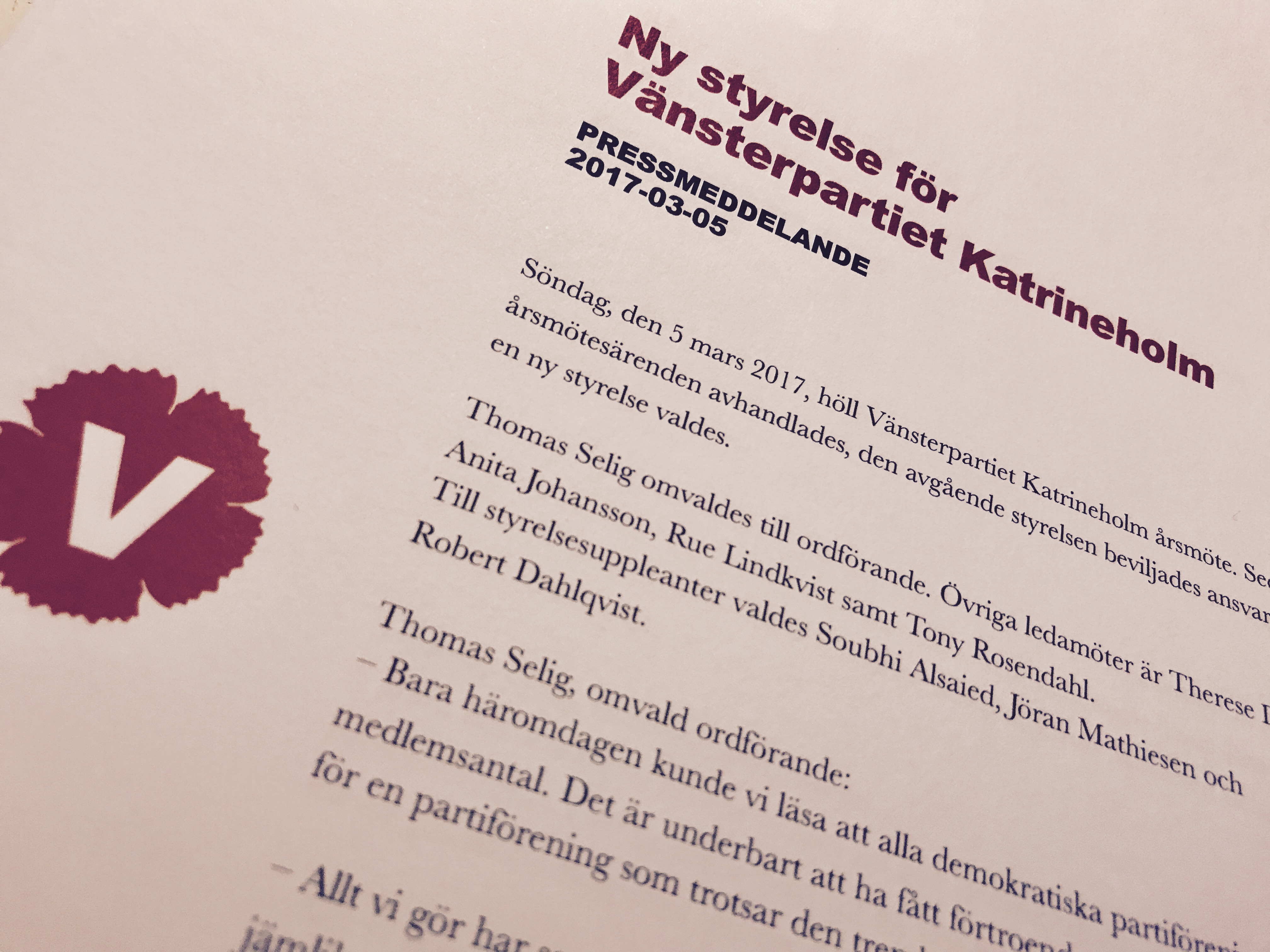Söndag, den 5 mars 2017, höll Vänsterpartiet Katrineholm årsmöte. Sedvanliga årsmötesärenden avhandlades, den avgående styrelsen beviljades ansvarsfrihet och en ny styrelse valdes.